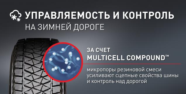 Достигается благодаря микропорам внутри уникальной резиновой смеси Multicell CompoundTM, которые обеспечивает эффективный водоотвод из пятна контакта, усиливая сцепные свойства шины и контроль над дорогой.